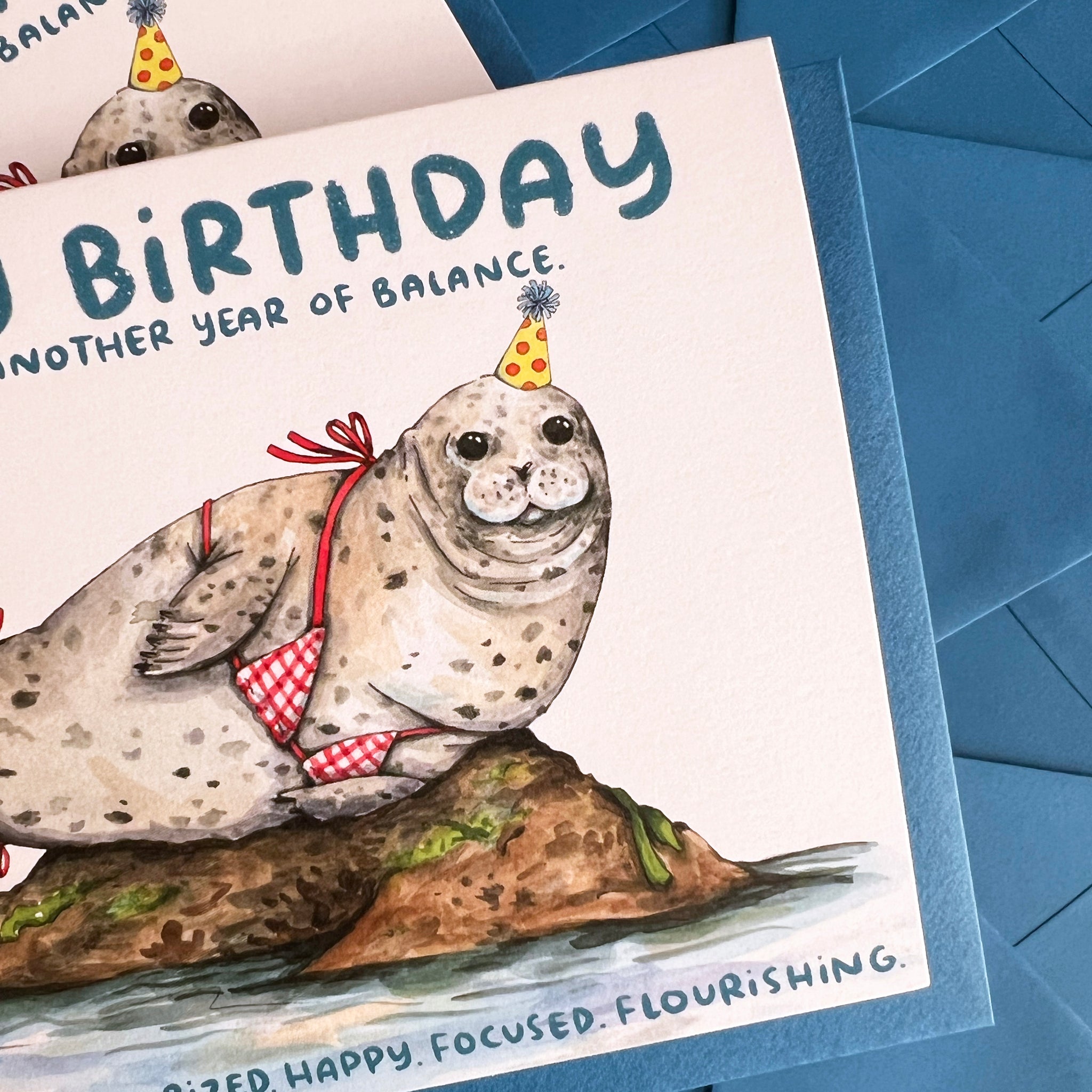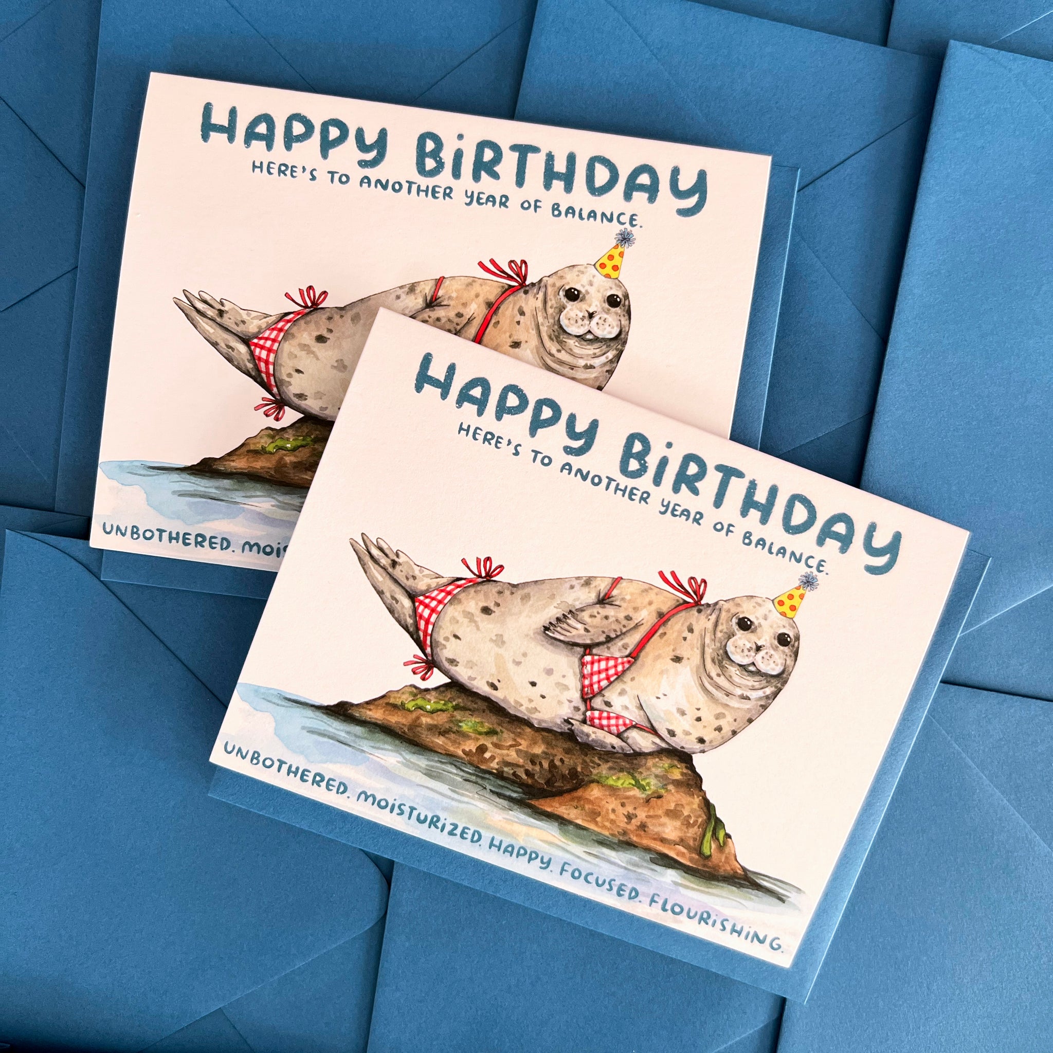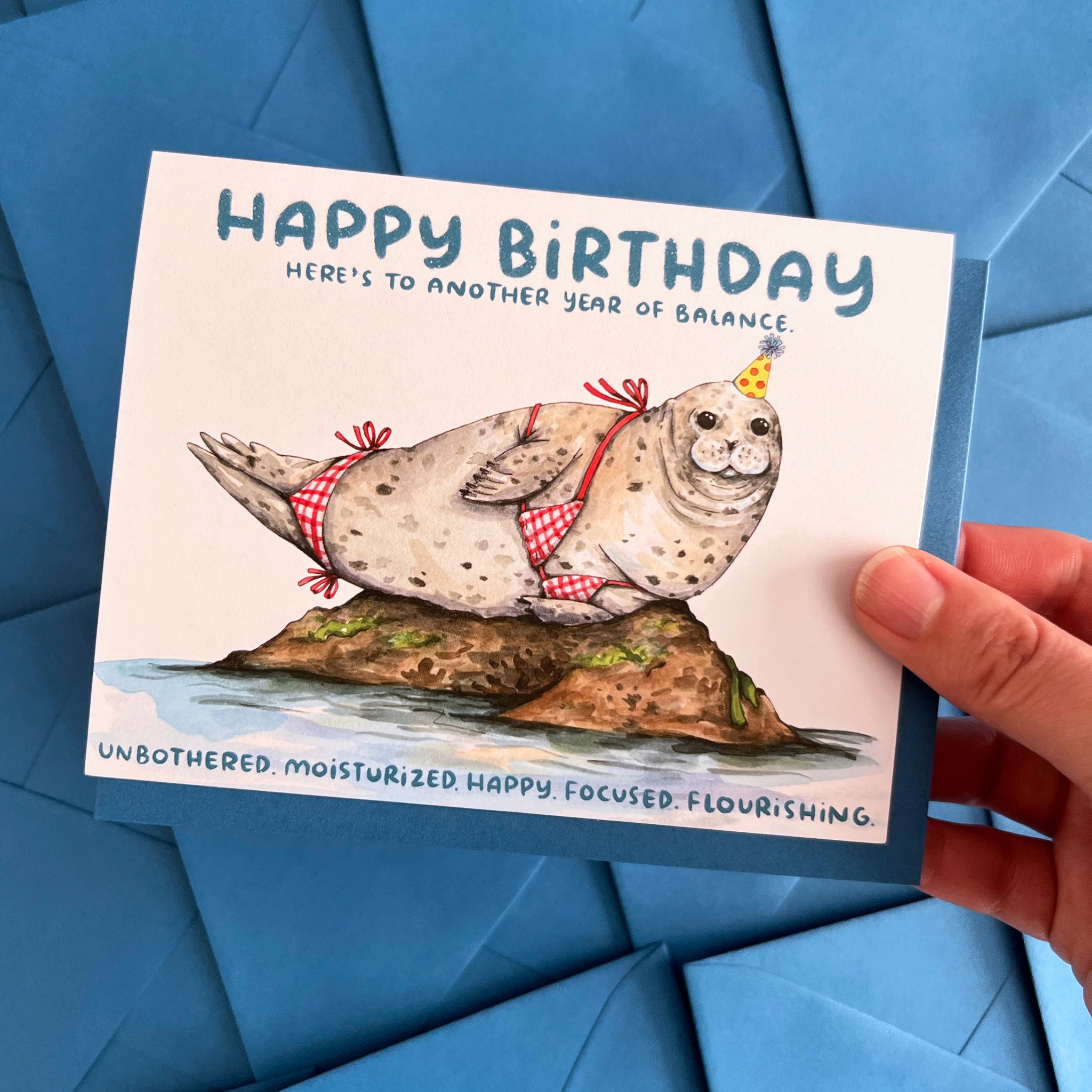 The perfect card for that balanced, unbothered, moisturized queen in your life is here, bikini and all! This card reads: "Happy birthday, here's to another year of balance. Unbothered. Moisturized. Happy. Focused. Flourishing." along with our favorite sassy seal balancing on her rock.