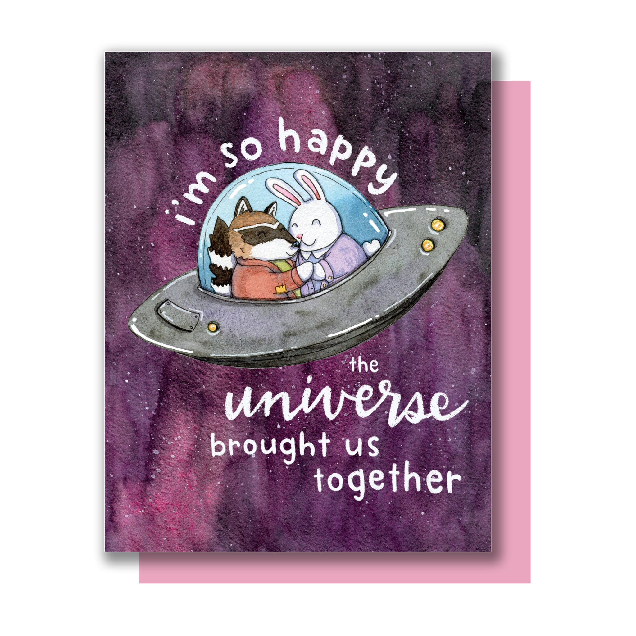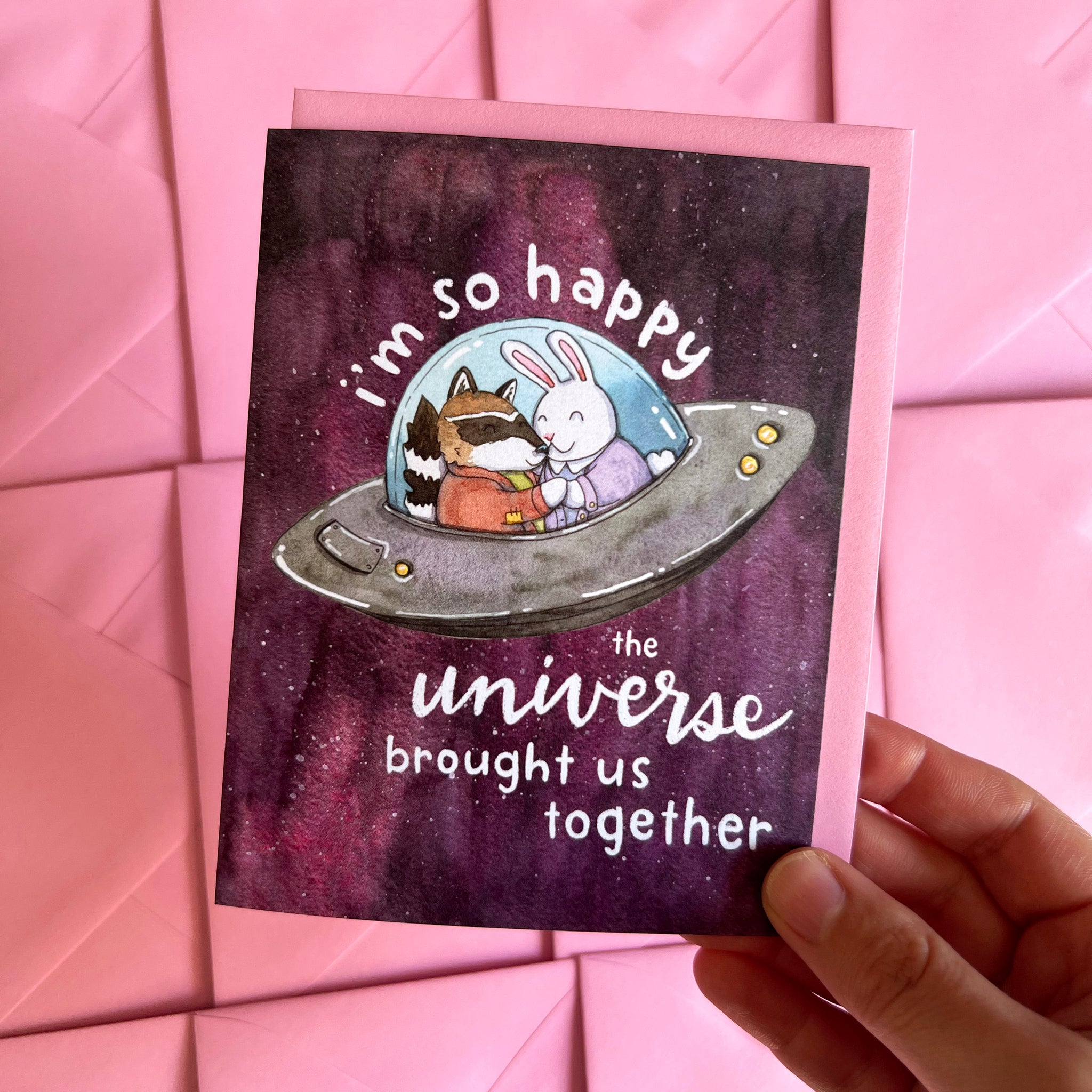 I'm so happy the universe brought us together- the perfect sentiment for your significant other and friends alike! This cute raccoon and bunny pair in a spaceship is ready to send your message into the universe!